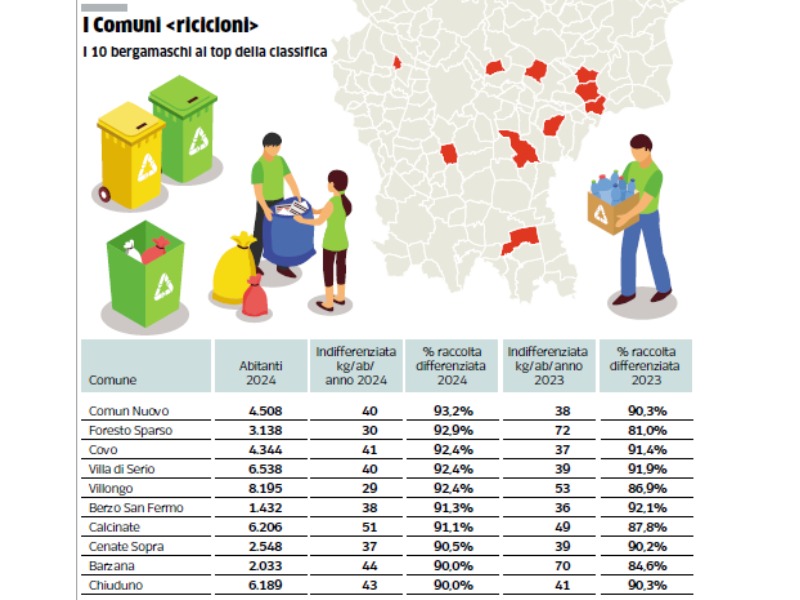 Non è più una novità, ma fa ancora notizia. Se non per Servizi comunali, lo fa per il resto del territorio e degli addetti ai lavori: Servizi Comunali si conferma al top della qualità per la raccolta rifiuti nel territorio bergamasco. A dimostrarlo è la classifica stilata nel report di Legambiente relativa al 2024:Servizi comunali ottiene il podio con Comun nuovo comune più riciclone della bergamasca (93.2 per cento), Foresto sparso al secondo posto (92.9 per cento) e Covo (92.4 per cento). Scorrendo la classifica, anche la quinta, la settima e la decima posizione è targata "servizi comunali" rispettivamente con Villongo (92.4 per cento), Calcinate (91.1 per cento) e Chiuduno (90 per cento). In totale, i tre comuni più virtuosi e 6 dei primi dieci sono serviti da Servizi Comunali: "Questi dati dimostrano l'eccellenza che abbiamo raggiunto nel nostro servizio - spiega il direttore generale Enrico de Tavonatti -; e ci convincono di essere sulla buona strada. Il nostro obiettivo rimane quello di portare tutti i nostri comuni al 95 per cento e per alcuni casi, ci stiamo avvicinando".